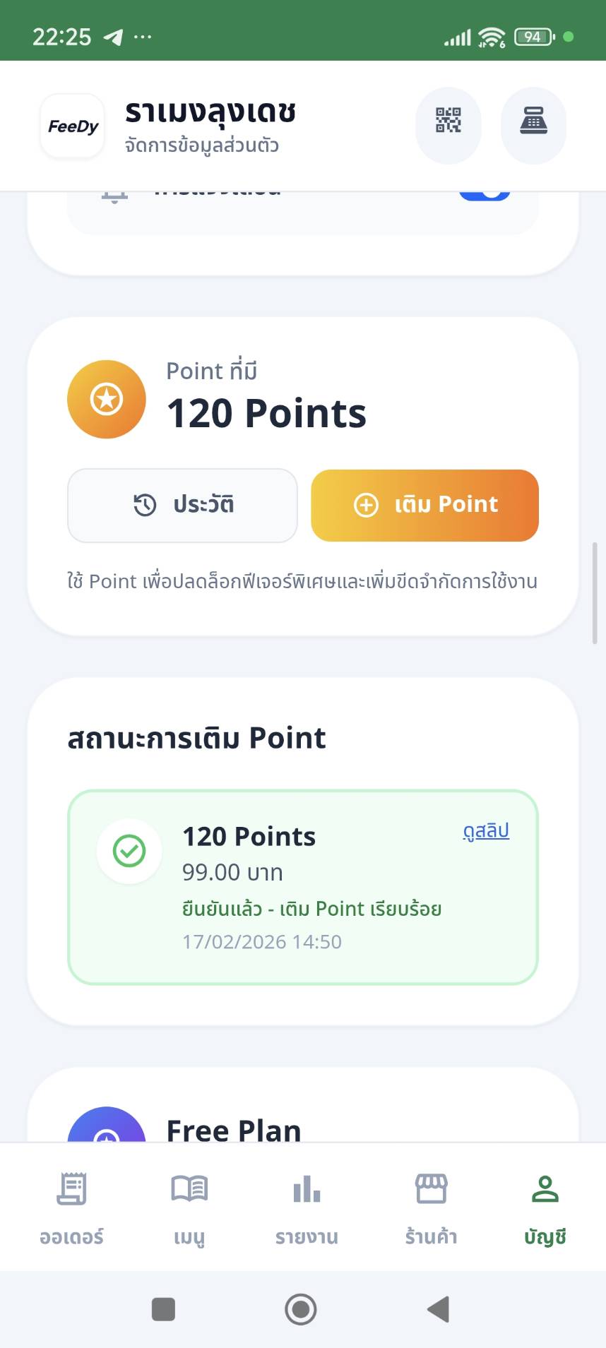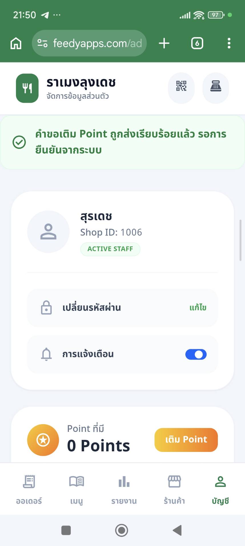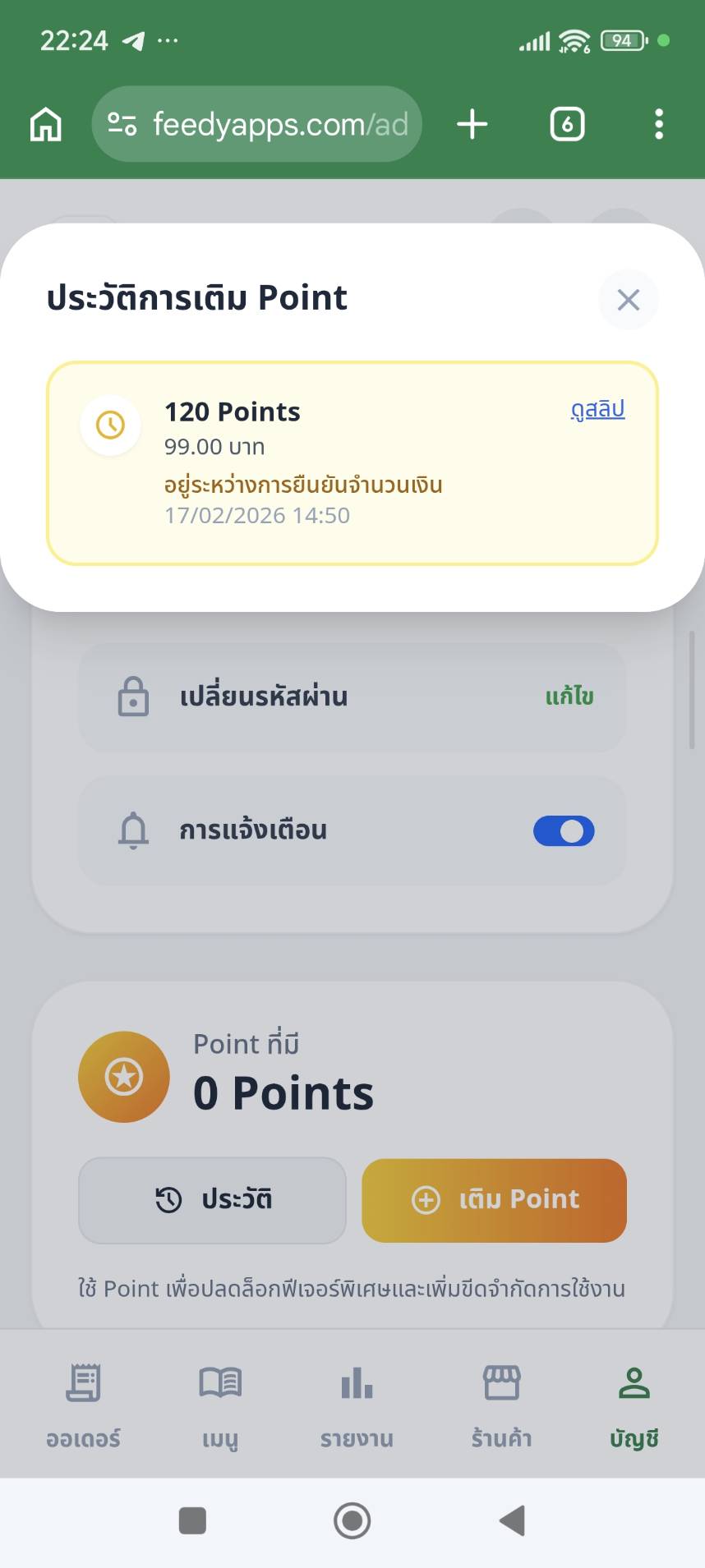 หากทางFeedy ตรวจสอบสลิปการโอนเงินเรียบร้อยแล้ว point จะถูกเพิ่มเข้าสู่ระบบ