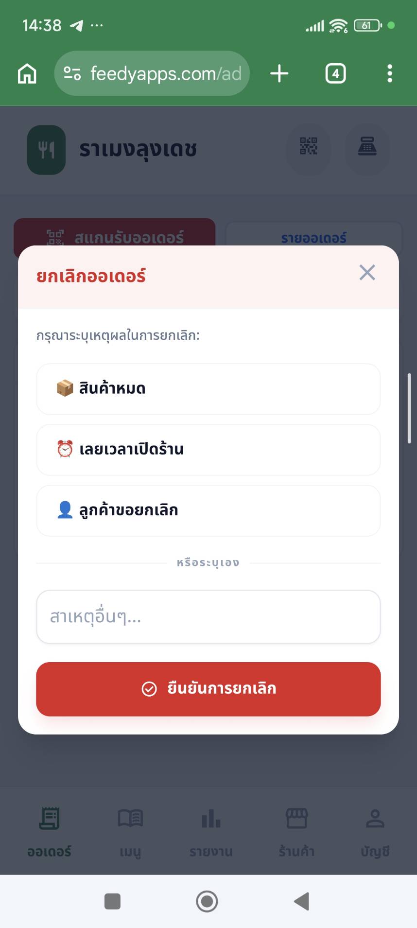 เลือกหรือพิมพ์สาเหตุที่ยกเลิก (เช่น วัตถุดิบหมด, ลูกค้าเปลี่ยนใจ)