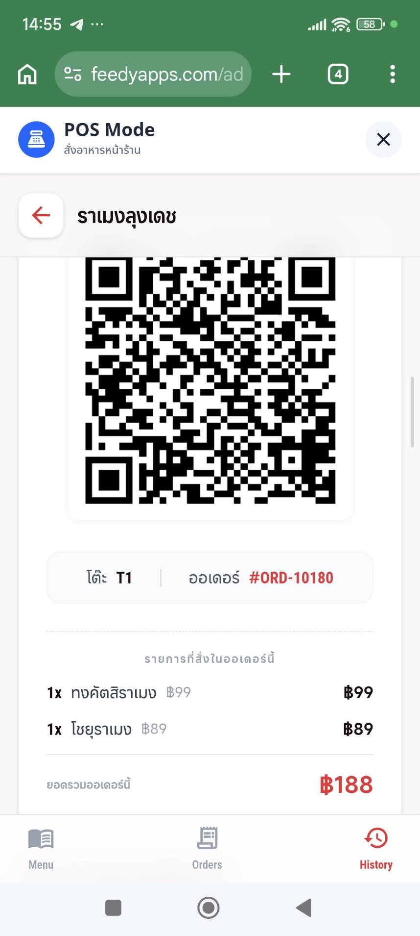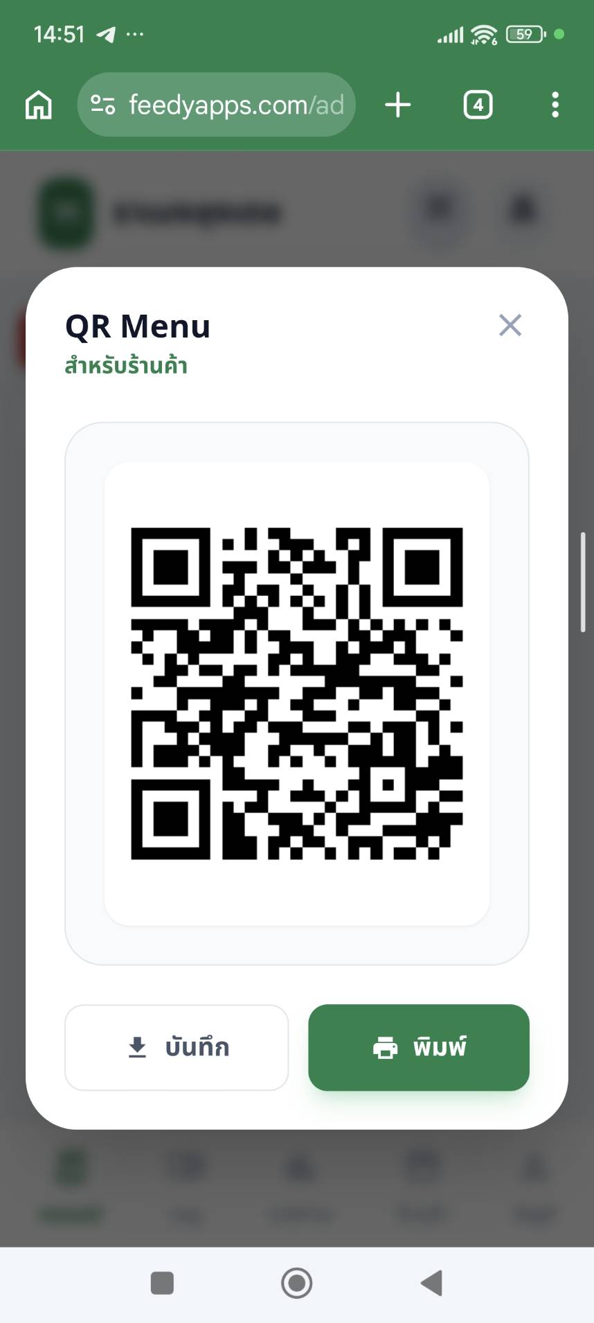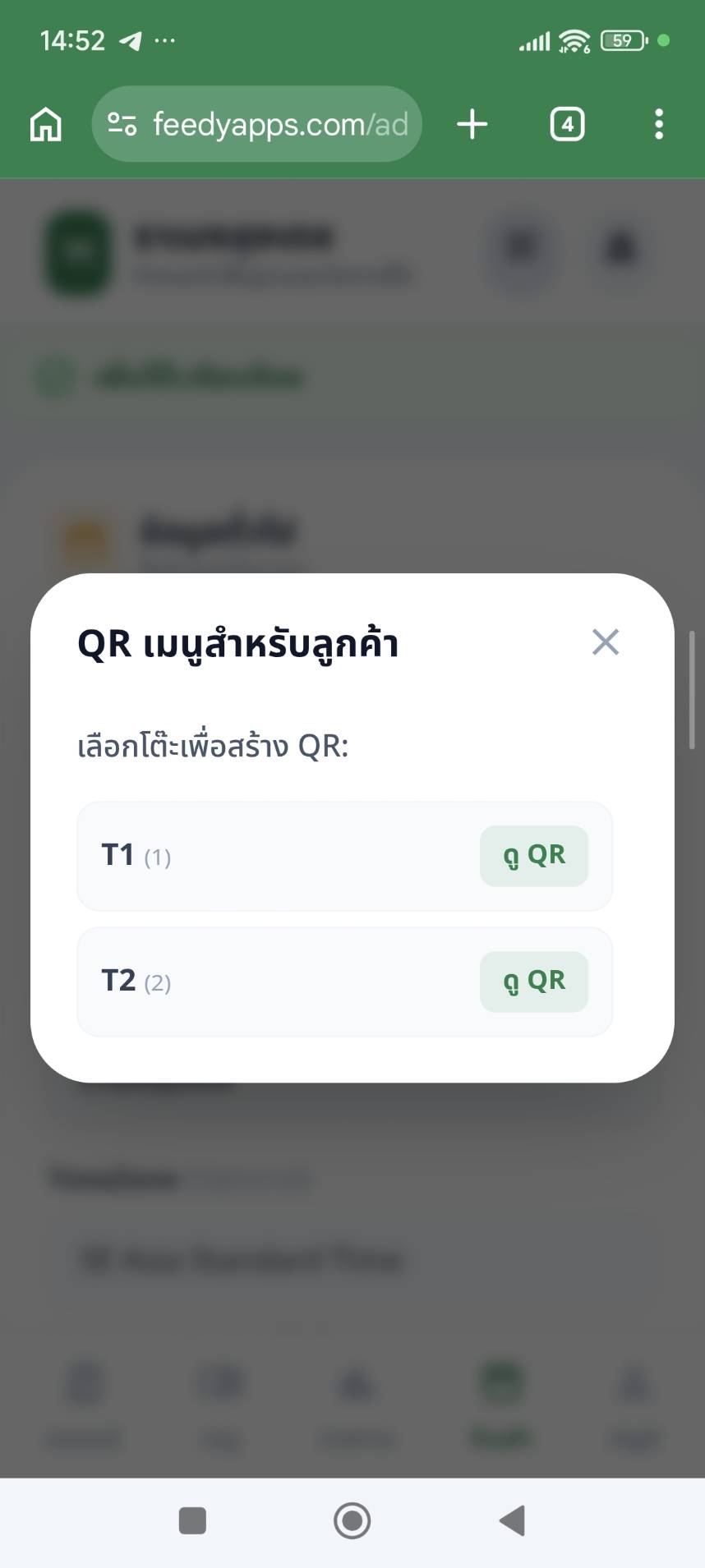 กดไอคอน QR Code ด้านบนขวา ระบบจะแสดง QR Menu ให้ลูกค้าสแกน หรือสั่งพิมพ์เพื่อติดหน้าร้าน
